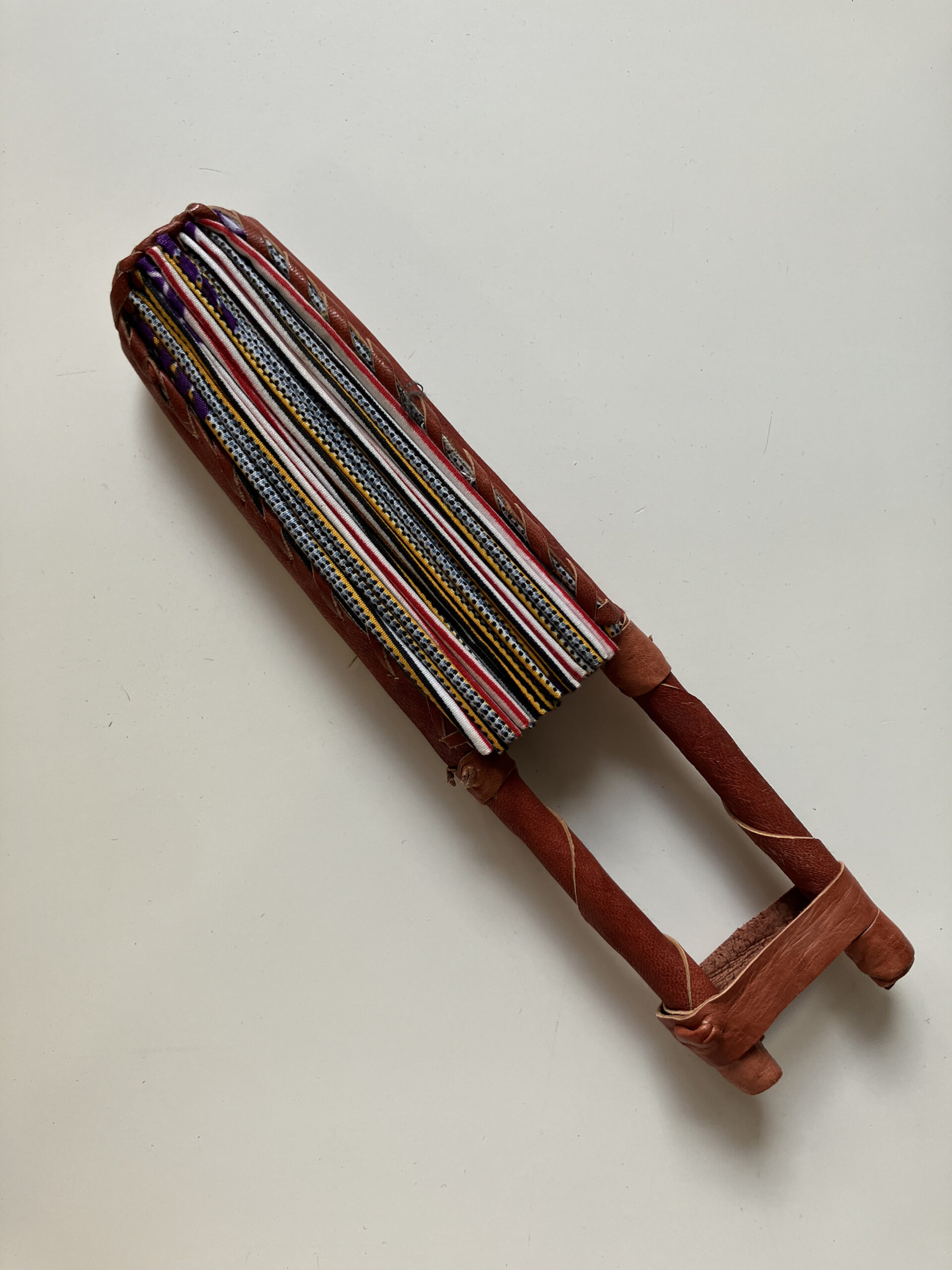 Materials: 100% cotton African wax fabric. Wooden and leather handles.